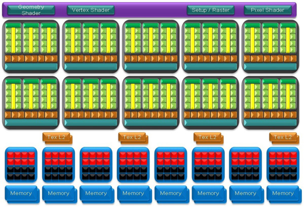 Im folgenden Bild ist die Architektur des GT200 übersichtlich dargestellt und lässt sich in drei wesentliche Teile splitten: Scheduler für anfallende Operationen (violett), Recheneinheiten für Abarbeitung (schwarz), Speicher-Interfaces und ROPs (blau). Wie in den vorherigen Unified-Shader-Architekturen hat man auch bei der jüngsten Auflage die Rechenpower in Clustern zusammengefasst und erreicht dadurch ein hohes Maß an Flexibilität bei der Konfiguration und eine maximale Chipausbeute pro Wafer. Ein solcher Cluster (10 Stück im Falle des unteren Bildes), namentlich bei Nvidia kurz als TPC (Thread Processing Cluster) verankert, fasst verschiedene Komponenten zu einem Bündel zusammen. Dazu gehören jeweils drei so genannter Streaming Multiprocessors (SMs), die wiederum aus acht einzelnen Shader Processors (SPs) bestehen. Neu ist hier beispielsweise ein lokaler Speicher innerhalb eines SM, der die direkte und schnellstmögliche Kommunkation zwischen SPs möglich macht. Dadurch will man weitere Latenzen in der Praxis einsparen, da nicht mehr der umständliche Weg über höher liegende Speicherebenen (Frame Buffer) gegangen werden muss. Komplettiert wird ein TPC durch entsprechende Filtereinheiten (jeweils 8 TUs) und einen großen L1-Cache-Speicher.