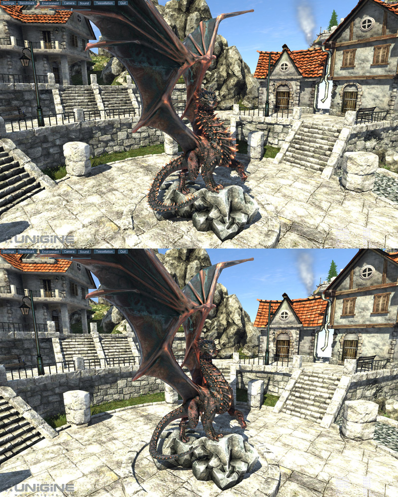 Folgend zwei Szenen aus Unigine Heaven, die die Funktionsweise der Tessellation-Engine verdeutlichen. Weiter unten finden Sie außerdem Tessellation-Benchmarks der GeForce GTX 470 in verschiedenen Demos, verglichen mit ATis aktuellem Flaggschiff.