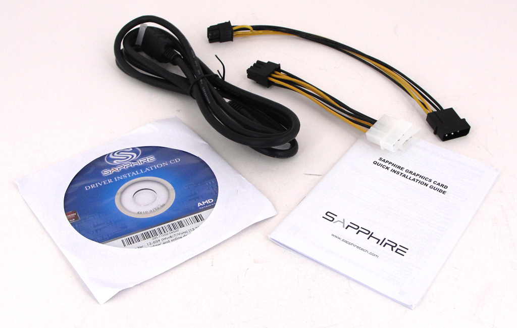 Dabei handelt es sich im Einzelnen um zwei PCIe-Molex-Adapter als 8- bzw. 6-Pin-Ausführung sowie ein HDMI-Anschlusskabel (1,8 m). Damit kann die Karte auch an älteren Netzteilen betrieben werden, die nicht entsprechende Anschlüsse zur Verfügung stellen. Der Verpackungsinhalt ist damit typisch umfangreich für eine Sapphire-Retail-Version. Adapter für analoge Monitore liegen nicht bei, da die Karte ausschließlich mit DVI-D und nicht DVI-I ausgestattet ist. Folgend der gesamte Lieferumfang der Karte im Überblick: