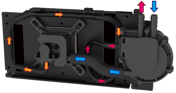Die Wasserkühlung stammt aus einer Kooperation mit Spezialist Arctic, dessen Logo man an der Seite des Kühlkörpers findet. Mit in den Kühlkörper integriert ist die Pumpe, so dass extern nur der Radiator im Gehäuse verschraubt werden muss. Die Kühlung erstreckt sich nicht nur über die GPU selbst, sondern auch über die Speicherchips und die Komponenten für Strom- und Spannungsversorgung. Für optimale Kühlung der GPU wurde ein Kupferkern integriert. Beim mitgelieferten Radiator, der stark an den Liquid Freezer erinnert, handelt es sich um ein Modell mit 240 mm x 120 mm, so dass ausreichend Potenzial vorhanden sein sollte, um die enorme TDP der Grafikkarte bändigen zu können (mehr dazu auf Seite 17 des Artikels). Die Außenabmessungen des Radiators betragen 278 mm x 116 mm x 60 mm und sollten bei der Gehäusewahl berücksichtigt werden. Die Schläuche zur Karte sind etwa 350 mm lang.