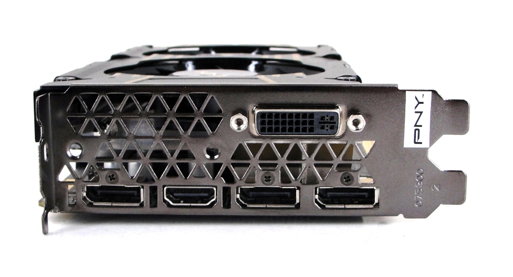 Gerade übertaktete Grafikkarten sollten natürlich gut gekühlt werden. Daher verbaut PNY auf dieser Karte nicht den Referenzkühler Nvidias, sondern eine leistungsfähigere und zugleich angenehm leise axiale Doppel-Lüfter-Kühlung mit 75-mm-Lüftern. Zwei Heatpipes sorgen hier in Kombination mit den Lüftern für eine effektive und zuverlässige Wärmeableitung. Ob die Karte die Versprechen des Herstellers halten kann, klären wir im weiteren Verlauf des Tests. Mehr dazu ab Seite 15. Positiv bleibt noch anzumerken: Mit einer Bauhöhe von zwei Slots werden die Dimensionen der Referenz nicht überschritten. Die Lüfter werden im Leerlauf abgeschalte.