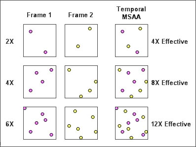 2x AA Masken, welche in einem anderen Winkel zueinander stehen, durch Temporal AA 4x Anti-Aliasing erzeugen, und dies