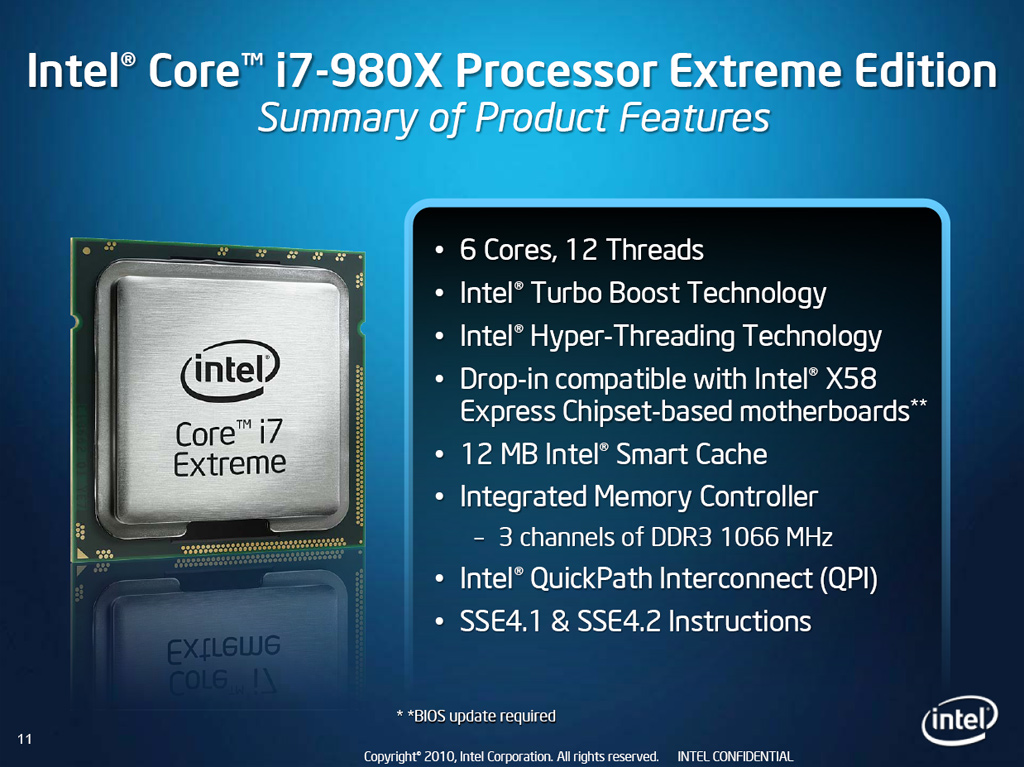Wie bereits im Vorwort erwähnt, hat Intel im November 2008 mit Nehalem eine neue Mikroarchitektur eingeführt. Einige Monate nach dem offiziellen Stapellauf von Nehalem, verpasst man der Technik eine Frischzellenkur und führt einen 32 nm DIE-Shrink durch. Die Westmere-Architektur ist dadurch deutlich platzsparender und auch bezüglich der Leistungsaufnahme ergeben sich neue Möglichkeiten für Chipgigant Intel. Entsprechend stellt man mit Gulftown den ersten 32 nm Prozessor mit sechs physikalischen Kernen vor. Dank Hyper-Threading-Technologie ist der auf 1,17 Milliarden Transistoren basierende Mikroprozessor in der Lage bis zu 12 Threads parallel zu bearbeiten und katapultiert SMT (Simultaneous Multi-Threading) im Desktop-Bereich in eine neue Dimension.