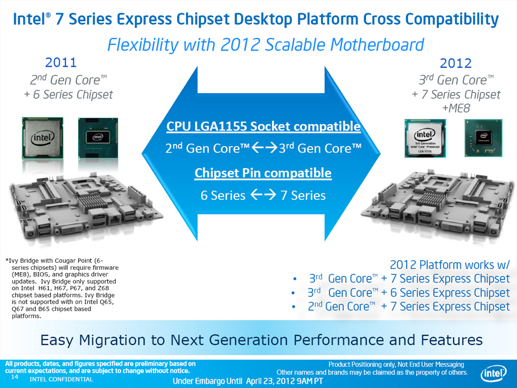 Intel präsentiert mit der dritten Core-Generation auch, wie erwartet, neue Chipsätze. Die Chipsätze der 7er Serie (Codename Panther Point) kommen dabei ebenso mit dem bekannten Sockel 1155 daher und das hat für den Kunden einen wesentlichen Vorteil: Kompatiblität mit bestehenden Produkten. Intel-Mainboards mit 7er Chipsatz können entsprechend mit Sandy Bridge Prozessoren der zweiten Generation sowie auch mit Ivy Bridge CPUs der dritten Generation arbeiten. Außerdem funktionieren Intels 22 nm Ivy Bridge Modelle auch auf den meisten Mainboards mit 6er Chipsatz (Codename Cougar Point). Im Klartext heißt das, dass Intel die Chipsätze H61, H67, P67 und Z68 als kompatibel zu Ivy Bridge deklariert, sofern die Hersteller der Mainboards mitspielen und gewisse Voraussetzungen erfüllen – Firmware- (ME8), BIOS- und Grafiktreiber-Update sind in der Regel ausreichend, mehr nicht. Wer ein Board auf Basis von Q65, Q67 oder B65 besitzt, wird leider nicht in den Genuss der 3rd Generation kommen können. Dennoch werden sich viele Kunden über dieses Umdenken von Intel freuen und können an ihren bestehenden Plattformen festhalten.