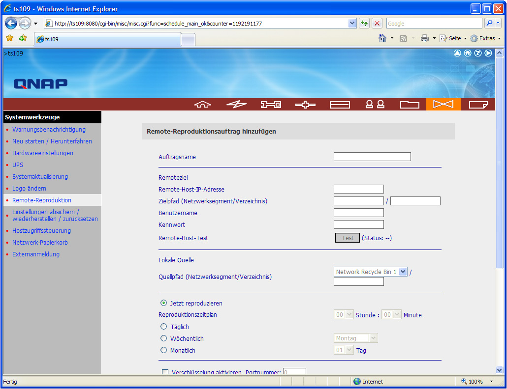 In den Punkten "Systemwerkzeuge" und "Gerätekonfiguration" finden sich Optionen für grundlegende Low-Level Einstellungen des Servers wieder. Der Administrator hat hier unter anderem die Möglichkeit einen Netzwerk-Papierkorb einzurichten, bestimmte Zeitpläne für die Remote-Reproduktion festzulegen, die Standby-Time zu steuern, das System für USV-Betrieb zu optimieren und vieles mehr. Sehr wichtig ist auch die mögliche Einschränkung beim Zugriff auf die Administration des Geräts. Mithilfe der Hostzugriffssteuerung kann man bestimmte IP-Adressen oder Netzwerke auf die Konfiguration beschränken, ebenso auch festlegen ob Telnet- oder SSH-Verbindungen zugelassen sind und welche Ports hierfür genutzt werden sollen. Ein weiteres nettes Feature ist die Warnungsbenachrichtigung, die dem Administrator E-Mails bei eventuellen Fehlfunktionen des TS-109 sendet und man damit immer auf dem Laufenden ist, auch wenn der Server in der Ferne steht. Zugriff erhält der Administrator zudem sowohl auf das SATA-Laufwerk als auch auf eventuell angeschlossene USB- und eSATA-Laufwerke bzw. einen USB-Drucker. Festplatten oder USB-Sticks können durch die Gerätekonfiguration beispielsweise auch formatiert (FAT oder EXT3) werden und mittels Q-RAID 1-Feature in das System eingewoben werden. Alles in Allem hält der interne Bereich eine Fülle an Optionen für den fähigen Systemverwalter bereit. Ein klein wenig Vorwissen und Verständnis sollte man aber mitbringen, auch wenn die Dokumentation sehr ausführlich und in Deutsch ist.